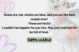 2. “Roses are red, violets are blue, and you are the best couple ever! These are facts! I couldn’t be happier for you two. May your married life be full of love. Happy wedding!”
