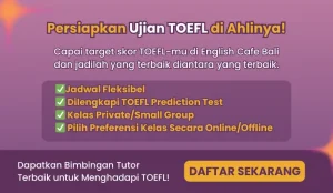 Dalam hal ini, English Café Bali sebagai tempat kursus bahasa Inggris di Bali dan tempat kursus persiapan TOEFL dan IELTS bisa dijadikan pertimbangan untuk menemani teman-teman belajar tentang grammar yang akan sangat berguna saat menjawab soal grammar TOEFL, lho…