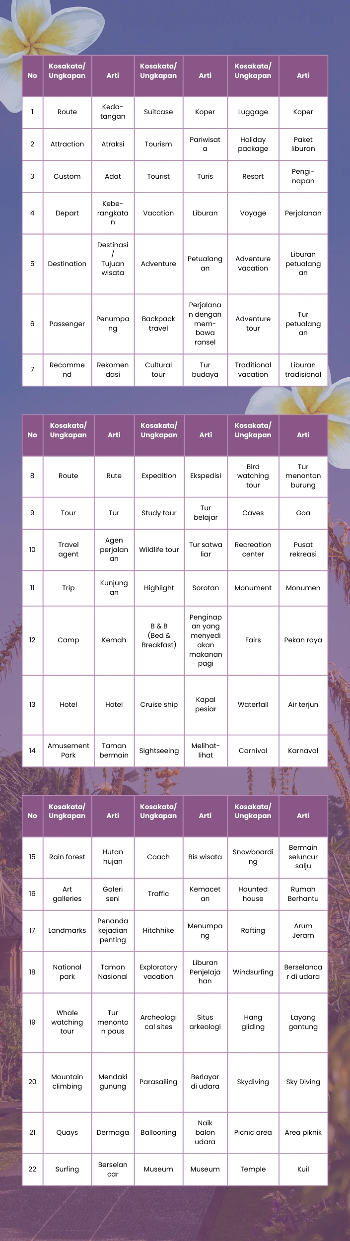 - Apa saja kosakata bahasa Inggris yang umum terkait tourism digunakan ?