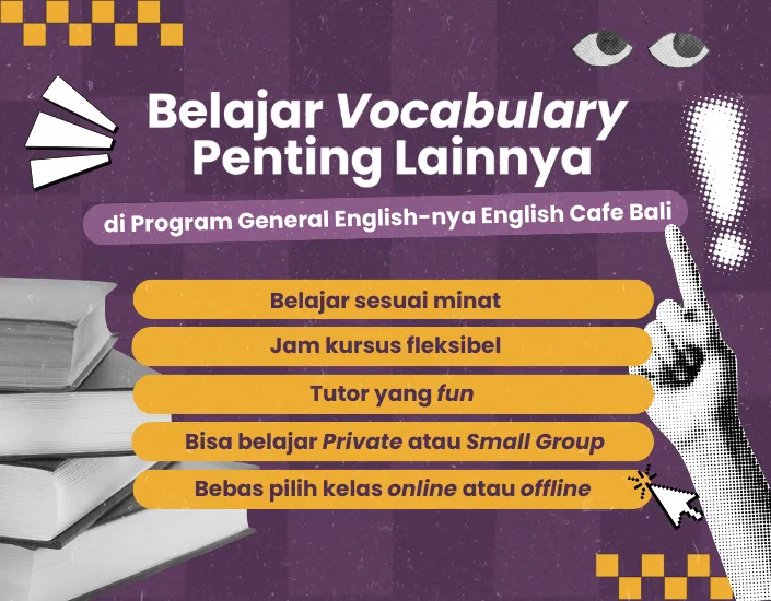 Kamu masih sulit ngerti kata-kata bahasa Inggris yang mirip tulisannya, bunyinya, atau bahkan artinya? Ini nih saatnya kamu upgrade kemampuan kamu bersama English Café Bali di Program General English yang berani bikin kamu explore vocabulary untuk komunikasi sehari-hari. Kok bisa sih?
